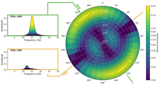 Polar spectral plot of the data measured with the sensor on the Minaret stalagmite (STAL) oriented N52° E (Y-axis). The radius axis shows the frequency from 11 to 16 Hz. Black lines highlight the variations in the color-mapped spectral amplitude. On the left, two examples of spectra are shown.