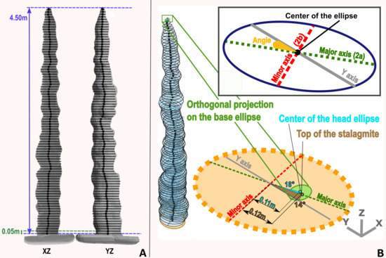 The combination of these parameters permits quantifying the shape of the stalagmite and its variation to create a model of the stalagmite based on elliptical cross-sections (Section 2.3.2) but also to choose the geometrical parameters for the analytical analysis (Section 2.3.1).