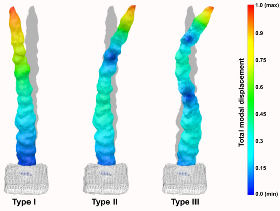 Natural frequencies of the stalagmite were calculated with the FEM (Section 2.3.2). Each detected type of mode shape (see Figure 9) has two distinct natural frequencies (Table 3). The lowest frequencies are identified at 12.81 and 15.45 Hz for the first type of mode shape (Type I, Figure 9). Intermediate frequencies at 50.56 and 59.76 Hz appeared for Type II (Figure 9), and finally, Type III (Figure 9) displays the highest recordings frequencies at 125.1 and 132.8 Hz. For each of these modes, the participation of the mass is mainly linked to a single perpendicular direction along the X- or Y-axis. The mass participation in Z is low, but it is always more important for an eigenmode with a Y orientation (North).