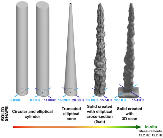 As pointed out by Gribovszki et al. [20], a perfect circular cylinder does not show a split of natural frequency (Figure 10). However, as shown in Figure 10, an FEM of a cylinder with an elliptical section results in split frequencies (corresponding to a particular type of mode shape) having the same polarization characteristics as the ones observed in the field (perpendicular polarization). The more elliptical shape of the Minaret stalagmite has already been demonstrated by the in-depth study of the 3D scan (Section 3.2.1), which supports the hypothesis that the shape is the cause of the split natural frequencies. The two found frequencies correspond to the frequencies identified for circular cylinders of diameters equivalent to the two axes of the ellipse. This observation could simplify rapid pre-analysis in the field. The natural frequencies of a circular cylinder can be obtained by simple analytical calculation (Section 2.3.1) in the case of slender candlestick stalagmites, and the results are close to equivalent numerical modeling.