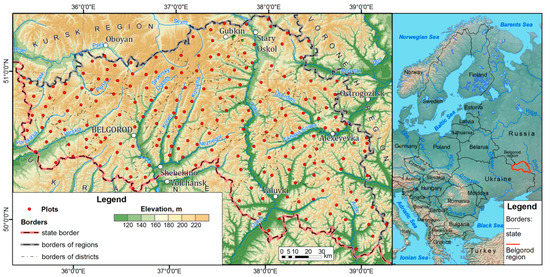 The territory under study is the Belgorod Region. This administrative region of Russia is located in the southwest of its European part, near the border with Ukraine (Figure 1). The area of the region is 27,100 km2.