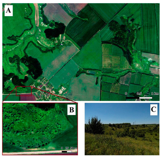 An example of light forests in satellite images and on the ground: (A) Small dry valley general view with a light forests. (B) Small dry valley fragment with a light forest. (C) Light forest’s ground photography (typical light forest near the village of L’vovka, east of the Belgorod Region).