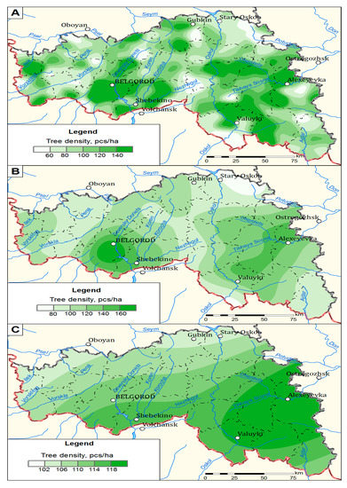 The density of trees in light forests at the local ((A), search radius 5 km), subregional ((B), search radius 15 km), and regional ((C), search radius 50 km) scale levels of generalization within the Belgorod Region, SW Russia.