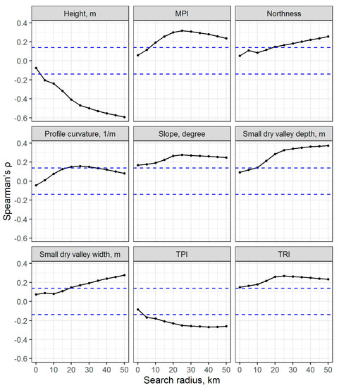 At the local level, the lowest correlation between the relief and the density of the trees can be observed. For all relief characteristics studied, except for the slope and terrain ruggedness index (TRI), the Spearman’s correlation coefficients are statistically insignificant for search radii up to five km. Based on this, it can be assumed that, at the local scale level, the relief is not the leading factor in the formation of light forests in small dry valleys of the region. The location of tree the seed import sources [39,40] and the nature of the economic use (grazing and haymaking, as well as grass burning) of the small dry valleys network [3] can be of great importance in the local level. However, this requires separate research.