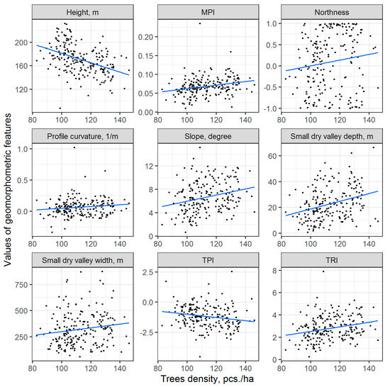 Relief characteristics also affect the density of the trees in light forests growing in the small dry valleys network. Their influence is manifested through the differentiation of the moisture conditions in the territory studied and the creation of various conditions for the fixing of tree seedlings in the soil. At the local level, the relief influence is minimal, and the density of trees is largely due to other factors. Of all the relief characteristics at the local level, statistically significant correlation was found only for the slope and TRI. In general, at the subregional and regional levels of generalization, the closest correlation is observed with the absolute height of a particular territory. The second most important factor at the subregional level is the morphometric protection index, and at the regional level, it is the depth of small dry valleys.