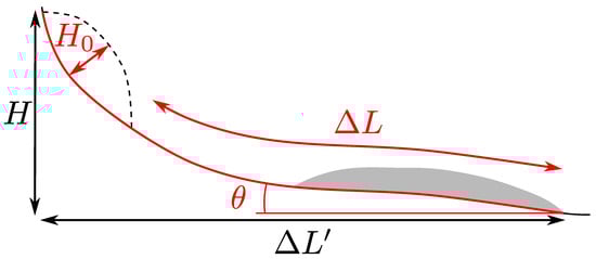 Parametrization of landslide mobility, with notations as in [5]. Dashed line: initial mass. Grey shaded are: final landslide deposits. H is the drop height, the horizontal travel distance. is the mass initial thickness, the travel distance along topography from the landslide scar toe, and is the average slope angle along the flow path. The notations in red are used for , and in black for .