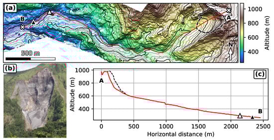 Destabilizations from the Samperre cliff, in Martinique, Lesser Antilles, involve volumes between 1 and m [39,40] that propagate on a complex topography (Figure 2a,b). As they detach from the cliff, old pyroclastic materials erupted from the nearby Montagne Pelée volcano desegregate rapidly and the landslide propagates as a granular avalanche. Massive destabilizations occur roughly every 10 years, as in 2009 and 2018 [39,40] and travel about 2 km in the Samperre torrent that has its source at the cliff toe (Figure 2c). The stream flows in a narrow (no more than 40 m wide) and steep-walled (up to 70 m high banks) ravine that confines laterally the avalanche. The volume involved in the August 2009 collapse is estimated at m in [39]. In 2018, the main destabilization phase occurred in early January, and involved at most m [41], as deduced from 1-m Digital Elevation Models (DEMs) comparisons between July 2017 (LiDAR) and mid-January 2018 (photogrammetric reconstruction). However, considering the cliff retreat between these two dates, we estimate a smaller m volume (see Appendix A).