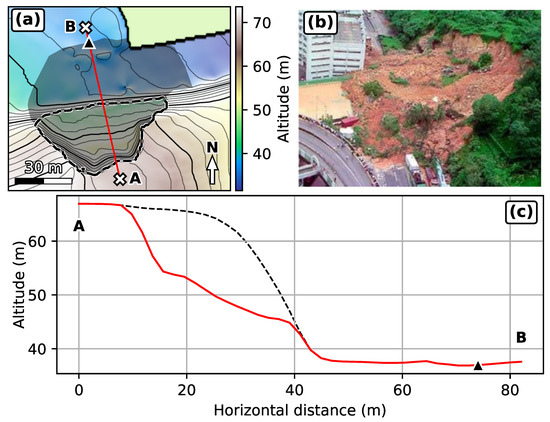 Fei Tsui Road debris slide. (a) Post collapse topography with deposits removed, 1 m DEM. Black dashed outline: landslide scar. Dark area: observed landslide extent. Bold contour interval is 10 m. Red line: cross-section along which travel distances are measured. Dark triangle: Observed travel distance. (b) Picture of Fei Tsui Road debris slide (GEO, Hong-Kong). (c) Cross-section along red line in (a). Red line: Post-collapse topography. Black dashed line: Reconstructed pre-collapse topography with deposits removed. Black triangle: observed deposit extent.