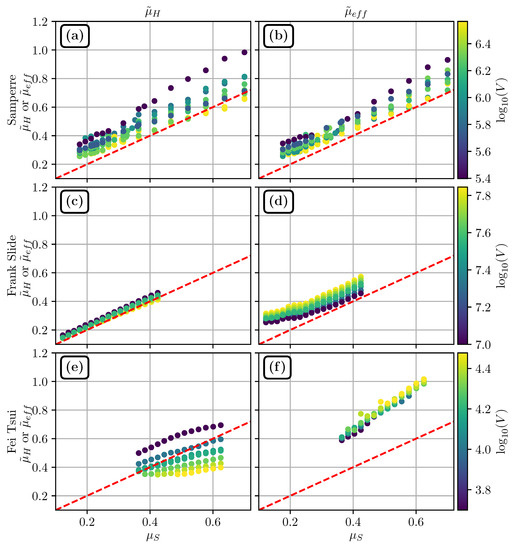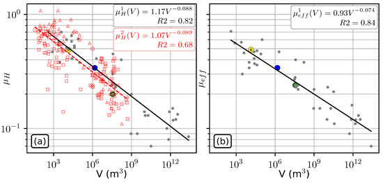 In comparison, numerical modeling and in particular shallow-water models are commonly-used to carry out site-specific hazard analysis, e.g., [27,28,29]. However, many simulations (up to 1000 or even 10,000) are needed to perform a rigorous probabilistic hazard analysis, e.g., [30]. Besides, estimating parameters can be difficult, or at least time consuming and costly, which is often incompatible with operational constraints where hazard assessment must be carried out quickly. Rheological parameters can be estimated by back-analysis when previous events are documented, but the extent to which results can be used for forward prediction is hard to constrain [28]. Rheological parameters can also be empirically deduced from mobility indicators. In particular, the effective friction coefficient , whose definition differs from the Heim’s ratio as it takes into account the initial mass geometry, proved to be a relatively good estimation of the friction coefficient to be used in simulations needed to model observed deposits [5].