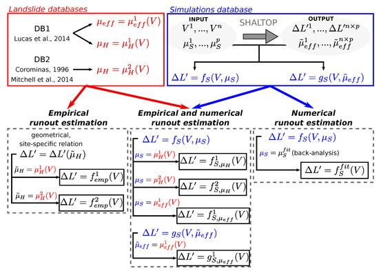 We use three different methods to estimate the horizontal travel distance directly from the landslide volume V. They are summarized in Figure 6. We use empirical data from DB1 or DB2, site-specific numerical simulations or a combination of the two. For the sake of clarity and simplicity, we do not explicit the functions that will be mentioned hereafter. It can be any kind of statistical model fitted to the landslide travel distances databases, or to the numerical simulations results, provided the associated uncertainties can be estimated. In this work, we use power law relations that are fitted by transforming the variables on a logarithm scale and by fitting a linear regression model using Ordinary Least Square (OLS) regressions (see more details in Appendix B). Thus, the final relation relating to V has the form:
