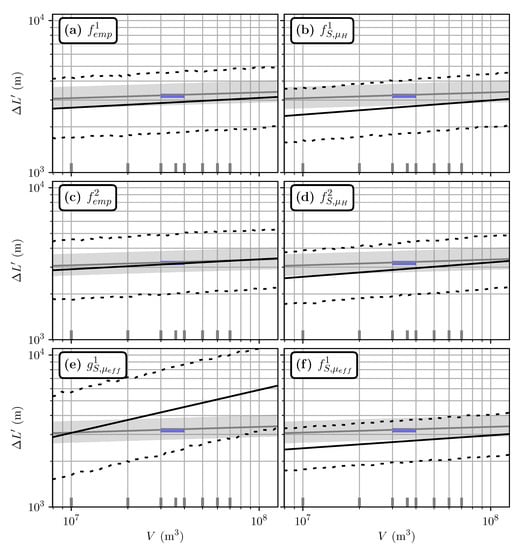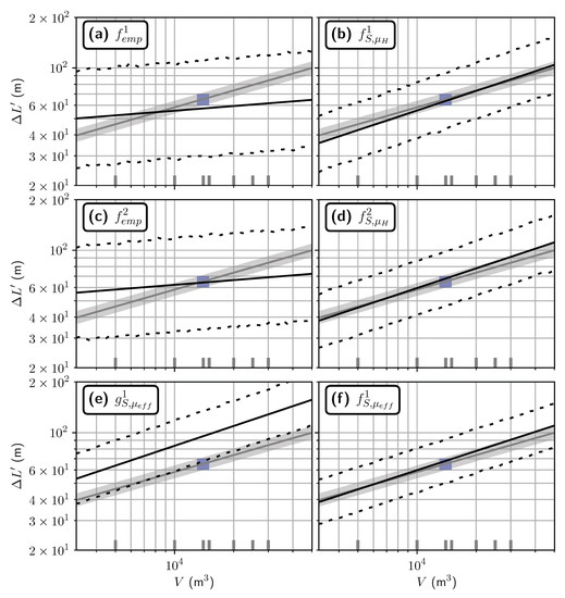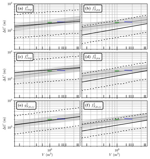 Travel distance estimated from volume for the Samperre case study. Green and blue rectangles: estimations of volumes and travel distances for the 2009 and 2018 collapses, respectively. Grey line: Numerical estimation from back-analysis (), with . The grey area is the upper and lower limits of the 95% prediction intervals derived for . (a) Estimation with . (b) Estimation with . (c) Estimation with . (d) Estimation with . (e) Estimation with . (f) Estimation with . Black lines are direct estimates, dashed lines give the 95% prediction interval.