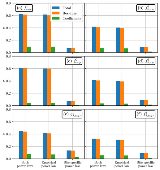 Uncertainty in travel distance estimation for the Samperre cliff case study, measured by the normalized standard deviation (see main body of the text). is computed by drawing randomly the power laws coefficients (green bars), the residuals (orange bars), or both (blue bars). As each estimation is the combination of two power laws, we consider uncertainties on the first power law derived from empirical databases (middle bars), on the second power law that is derived for the topography and simulation (right bars), or on both (left bars). (a) Estimation with . (b) Estimation with . (c) Estimation with . (d) Estimation with . (e) Estimation with . (f) Estimation with .
