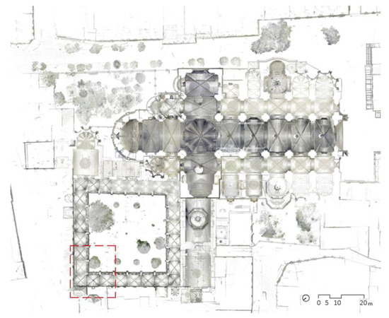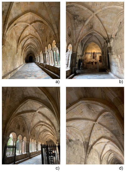 The cloister (Figure 2) is a 12th century construction, although it was completed at the beginning of the 13th century. Its situation breaks the canonical scheme of contemporary cloisters since it is located in the upper left part of the transept. This is due to the use of pre-existing Roman structures, specifically the wall of the Temenos that delimited the sacred area of the temple of Augustus. This imposing wall stood more than 12 m in height, and more than 115 linear meters are still preserved in the city. This wall served as a boundary of the cloister, where the medieval perimeter wall adheres directly to the Roman wall. It is a singularity in the history of architecture and causes a variable of uncertainty in the mechanical behavior of this wall.