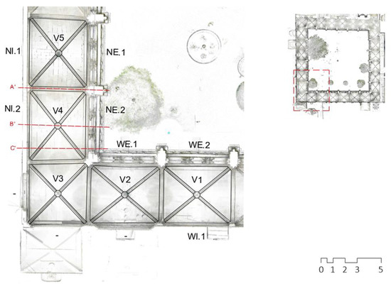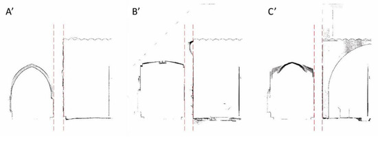 Complementary, a 2D verification is carried out in the north bay adjacent to the corner, and three cut planes (A’, B’, and C’) are defined (Figure 3). That cross-section of the openings aims to visualize the medieval wall in relation to the Roman wall.
