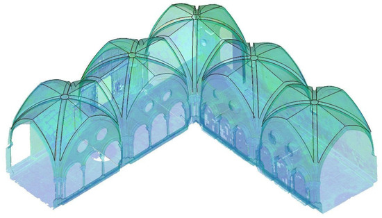 Once the mesh is obtained, the geometry of reference is defined for each vault through selected points. The imposts of the different arches (ribs, cross arches, and transverse arches) and the keystones, both of the vault and of the arches, are established. Finally, a third point is defined in the middle of each arch. The model is completed with the surface that covers the space between arches (Figure 4). Each theoretical vault is then compared with the equivalent real vault. This model assumes the deformations that the arches may have undergone over time, and allows the identification of anomalies mainly in the severies.