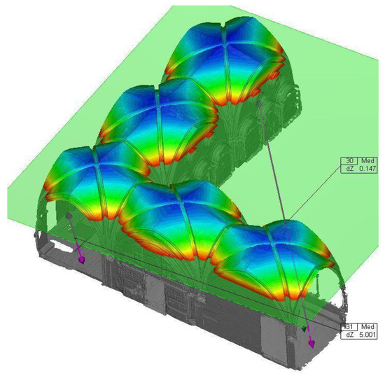 Regarding the elevation map, a height difference of 0.15 m has been identified on the ground floor. A horizontal comparison plane is defined at 5.00 m height from the average height of the ground (Figure 5). This position is above the spring line, which makes it possible to avoid the lower part of the vaults, which is very vertical compared to the rest of the surface.