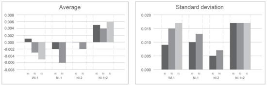 Regarding the numerical results obtained from the comparison with the point cloud of the walls. (Table 2) synthesizes the main parameters obtained. From a quantitative point of view, the analysis of results focuses on the interior walls, since the change in plane between the lower and upper part of the exterior walls distorts the values in method (c). According to the average distance (mean) and the standard deviation (STD), it is observed how method (a) is the one that best approximates the real wall, and method (c) the one that raises the greatest discrepancies. In turn, the latter is the one that allows us to identify the leaning suffered by the walls. The maximum out of plumb values according to method (c) are found at SI.1 = 0.058 m and WI.1 + 2 = 0.055 m. It is also striking how when considering sections 1 + 2 on the north wall, the values tend to equalize (Figure 7).