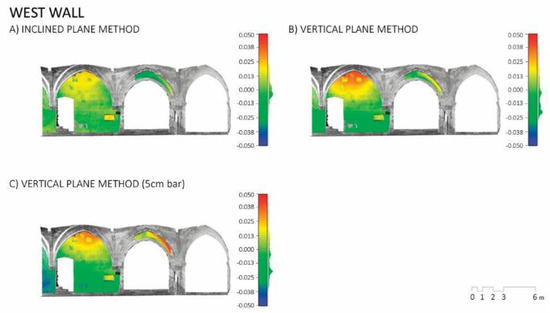 The distance maps corroborate the values indicated in (Table 2), and allow identifying the areas where the main discrepancies occur. In the case of the west interior wall (SI.1), the definition of the comparison plane (a) establishes smaller distances than (b) and (c). In any case, the main distances are in the upper part of the wall, with a leaning towards the interior of the gallery (Figure 8).