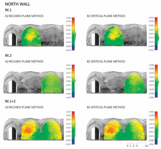 On the north wall, the different areas where the main discrepancies are concentrated according to the reference plane stand out. Thus, in section NI.1 the highest values are concentrated in the central part of the wall, while in section NI.2 they are concentrated in the upper part. In both cases, the anomaly occurs towards the interior of the gallery. The results change when the plane is defined from the two bays (1 + 2). Thus, for the three methods ((a), (b), and (c)) in section NI.1, the highest values are concentrated in the center and upper left, while in NI.2 they are found on the right side (Figure 9).