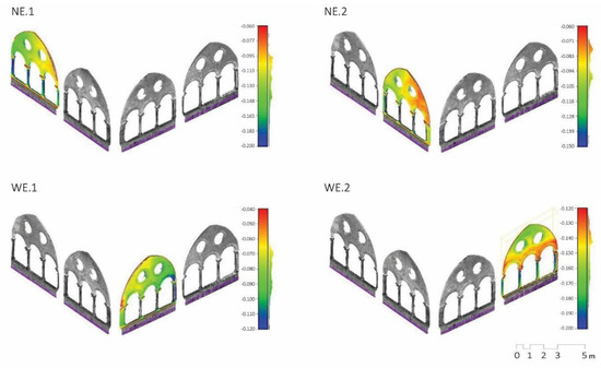 On the other hand, the results are shown on the exterior walls according to method (c). It is observed how the sections NE.1 and NE.2 concentrate the anomalies on the side near the corner, with NE.2 being the one with the highest values. In the west section, section WE.1 is very well plumbed, while section WE.2 is the one that presents a clearer out of plumb, although this occurs in the arches supported by the paired columns. It can be interpreted that, in this case, there is a leaning of the upper part of the wall towards the center of the cloister (Figure 10).