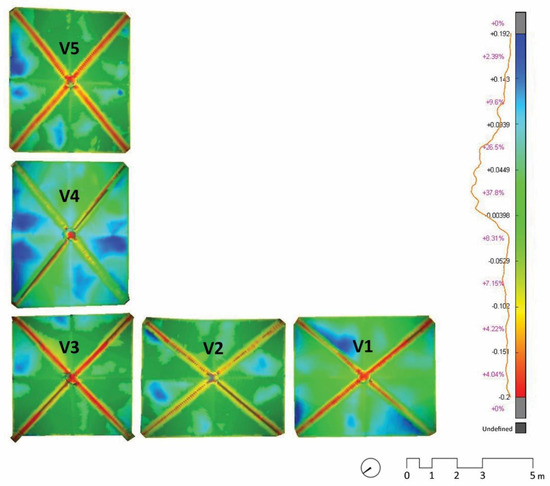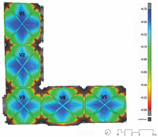 Regarding the study of the vaults in relation to a common horizontal reference plane, the distance map shows the formal differences between theoretically equal vaults. These differences go beyond those caused by differences in the ground floor measures, since in each individual vault there are anomalies that distort the symmetry that should exist in their deployment. Vault V4 is especially remarkable, since the longitudinal vertex is evidently misaligned to the sides of the vault keystone.