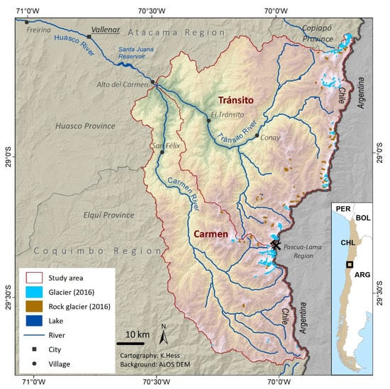 Mountain glaciers play an essential role as water resources in arid and semi-arid regions [,,]. In the case of Chile, glacial meltwater is crucial for more than 70% of the population [,]. While Andean glaciers are severely affected by climate change, those in the semi-arid North-Central Chile have received less attention []. Likewise, the regional importance of rock glaciers for water storage becomes increasingly evident [,,]. Declining precipitation and aridification in northern Chile over the 20th century [] cannot solely be drawn back to El Niño Southern Oscillations (ENSO) variability. Rather, sea surface temperature change from the South Pacific Amundson Sea region has influenced the winter storm tracks in North-Central Chile []. Average temperatures rose by 1–2 °C during the 20th century [,] and will continue to rise in the future with longer periods of snow and glacier melt []. The 2019 IPCC (Intergovernmental Panel on Climate Change) special report on the Ocean and Cryosphere in a Changing Climate (SROCC) predicts that the Andean cryosphere continues to decrease, and small glaciers will disappear towards the end of the century []. The water stored in the glaciers of North-Central Chile determines the potential for irrigated agriculture []. Snow and ice melt are indispensable for regular water availability, especially in years with low or zero summer precipitation [,]. It is, therefore, important to precisely quantify current glacier areas and changes to them to estimate the remaining water stored in the cryosphere []. The reduction in annual runoff may exacerbate conflicts between different water users [], such as agricultural producers, mining companies, and local communities. The case study of the Huasco valley has witnessed conflicts over water governance ever since the Pascua Lama gold mine in the upper valley section became a focus of resistance for the controversial extraction of mineral resources in the Andean Main Cordillera and faced increasing media scrutiny [,,]. Environmental impacts of mining activities on glaciers and regional water availability have been in the foreground in this conflict.