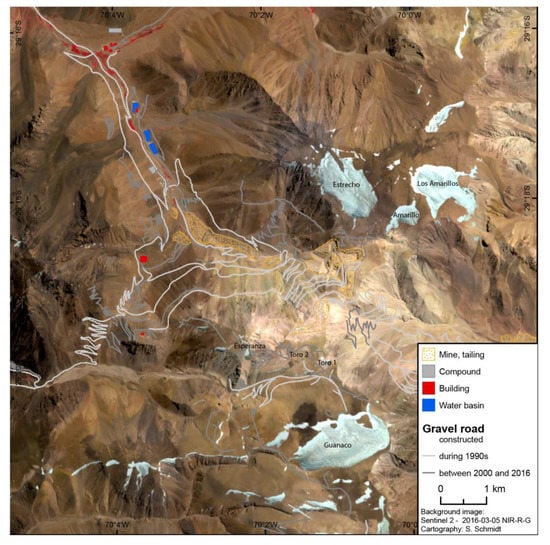 The upper Huasco valley became prominent due to the conflict over the construction of the Pascua Lama open-pit mine at the Argentine–Chilean border [,,,] (Figure 3). The Canadian company Barrick Gold planned to mine one of the largest remaining gold deposits in the headwaters of the Huasco valley at altitudes between 4400 and 5300 m [,]. The project gained international attention when the first environmental impact assessment (EIA), approved in 2001 [], including the plan to relocate 10 ha of the ice-covered area as the gold is located underneath the three glaciers Toro 1, Toro 2, and Esperanza [,,,,]. After a second, revised EIA in the context of Barrick’s plans to expand the project in 2004, public resistance increased significantly [,,,,]. Nevertheless, mining construction started in 2009, while exploration work accompanied by road construction had already begun in the mid-1990s [] and is detectable on satellite imagery. Protests against the mine led to a temporary halt in 2013 [,]. In 2018, Chile’s environmental tribunal shut down the project [].