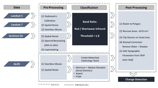 Since Sentinel-2A was launched in June 2015 [], Landsat-5 imagery from 31 March 1986, and Landsat-7 data from 31 March 2000, were used for glacier change detection. Similar dates were selected to minimize seasonal shading effects []. The radiometrically calibrated Landsat and Sentinel-2 scenes were mosaicked and resized to the study area. All preprocessing steps and classifications were carried out in ENVI 4.8.1 (Figure 4).