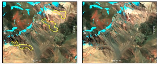 Fifty rock glaciers with an area of about 8.6 km2 were detected in 2016, similar to investigations by Nicholson et al. [], who mapped 40 rock glaciers covering an area of 6.30 km2 in 2004. In both studies, the numbers of identified rock glaciers were significantly smaller compared to the inventory by Azòcar et al. [], who mapped more than 400 rock glaciers. Due to the lack of distinct spectral signatures, rock glacier mapping using remote sensing data needs to be based on visual interpretation and on-screen mapping. Depending on the spatial resolution of satellite data, the inclusion of topographic parameters, illumination conditions, as well as typology of active or inactive rock glaciers, as well as solifluction lobes, the numbers can differ.