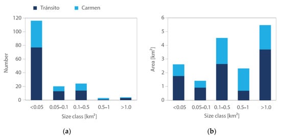 Area and number of glaciers by size class in the tributaries Carmen (light blue) and Tránsito (dark blue): (a) Number of glaciers by size class; (b) Area of glaciers in km2 by size class.