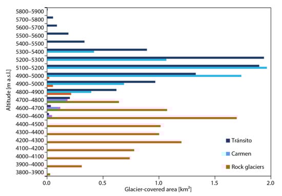 Hypsometric distribution of the glacier-covered area. The hypsometric distribution of glaciers in the tributaries of Carmen (light blue) and Tránsito (dark blue); rock glaciers in both tributaries (orange).