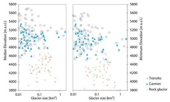 All clean-ice glaciers terminate above 4500 m and 50% even above 5100 m (Figure 7 and Figure 8). Almost 65% of the glacier-covered area is located between 5000 m and 5300 m, while the mean hypsometric glacier altitude in Carmen is 4980 m, which is around 200 m lower than in Tránsito where it reaches 5180 m. In Carmen, no glaciers exist above 5360 m, while glaciers in Tránsito can be found in altitudes of almost 5850 m. As Figure 8 depicts, the median elevation of clean-ice glaciers larger than 0.35 km2 is between 5050 m and 5270 m. In contrast, glaciers <0.1 km2 tend to scatter over a broad elevation range between 4570 m and 5700 m. The elevational analyses of glacier occurrence in the subregions show no meridional trend. The glaciers in the subregion Pascua Lama are characterized by the highest mean minimum elevation of 5190 m and mean median elevation of 5280 m, followed by the glaciers of Valeriano N at around 5170 m and 5260 m, respectively. The lowest minimum and median elevations can be found at 4880 m and 4990 m in Cholloy.