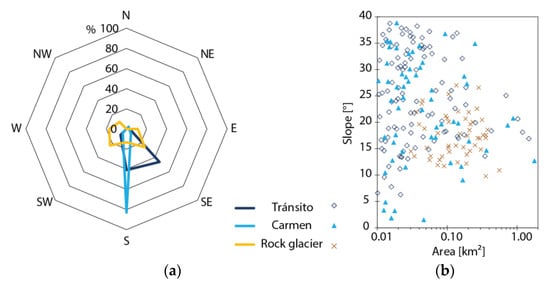 The main orientation of the glaciers is southwards (Figure 9). This is particularly pronounced in Carmen, where about 86% of the clean-ice glaciers are located on S-facing slopes, and not even one glacier is situated on NW- to NE-facing slopes. In Tránsito, 35% and 49% of the clean-ice glaciers are on slopes oriented towards the SE and S, respectively. Only four north-facing glaciers exist, which are smaller than 0.05 km2 and located on relatively flat slopes above 5300 m, with three of them even above 5500 m. The mean slope angle and the scatter of the glaciers increase minimally towards smaller glaciers (Figure 9). The average slope angle is 25°, whereas the differences between both tributaries are neglectable. The slope angle of the glacier larger than 0.5 km2 ranges from 13° to 25°, whereas the mean slope of glaciers smaller than 0.05 km2 varies between 2° and 39°.