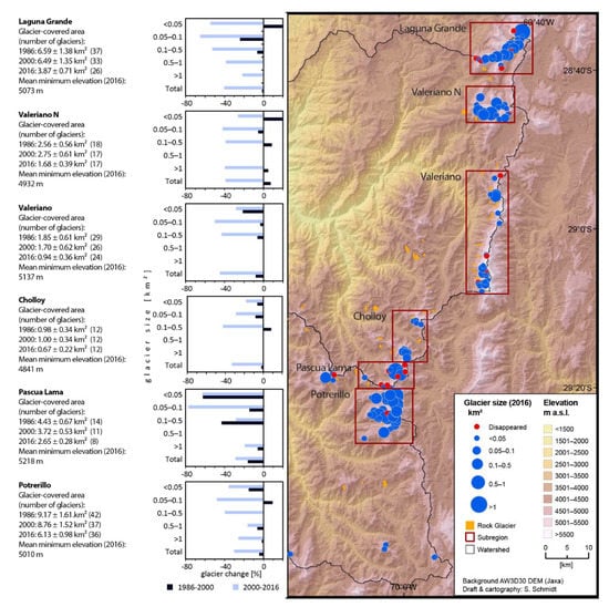 The subregional analysis (Figure 10) indicates that in Laguna Grande and Valeriano N, the glacier-covered area was almost stable (−2%) or slightly increased (7%). However, five glaciers—four of them belong to the size class <0.05 km2 and one to size class 0.05–0.1 km2—disappeared. Glaciers <0.05 km2 were characterized by an average increase of about 20% and 26%. However, the two glaciers >1 km2 were stable between 1986 and 2000. In Valeriano, the glacier-covered area decreased by about 8% (1.85 ± 0.61 km2 to 1.70 ± 0.62 km2), and glaciers <0.05 km2 lost 26% on average of their surface. In Cholloy, the glacier cover was almost stable, and in the southernmost subregion Potrerillo, a slight decrease of about 4% (9.17 ± 1.61 km2 to 8.76 ± 1.52 km2) was detectable, whereas three glaciers <0.05 km2 disappeared. With an average relative decrease of 2%, the three glaciers >1 km2—Guanaco, Canito, Ortigas 1, were almost stable. Contrary to this, in the surrounding of the Pascua Lama mine, the glaciers were characterized by a comparable high shrinkage rate. In this subregion, the glacier-covered area decreased from 4.43 ± 0.67 km2 to 3.72 ± 0.53 km2 by about 16%. The two largest glaciers of Pascua Lama showed a diverse retreat pattern. Contrary to Los Amarillos (1.25 km2 ± 0.13 km2), that was almost stable, the Estrecho indicated a decrease by about 11% (1.75 ± 0.17 km2 to 1.56 ± 0.15 km2). Furthermore, a comparable high mean relative decrease was detectable for the glaciers of the size classes 0.1–0.5 km2 and <0.05 km2, with about 39% (2.8% a−1) and 62% (4.4% a−1), respectively. Three glaciers belonging to the size class <0.05 km2 disappeared during this observation period.