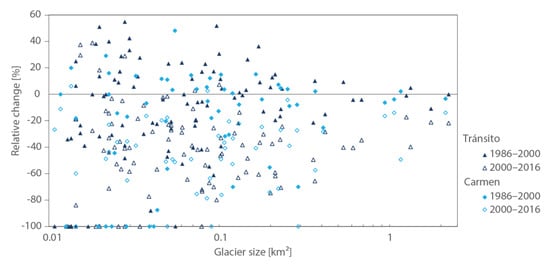 Relative glacier changes from 1986 to 2000 (points) and 2000 to 2016 (triangles). Some outliers (>60%) are outside the y-axis and are not shown.