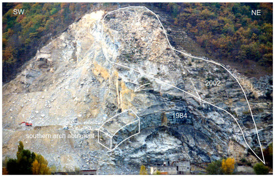 Excavation until 1961 produced a 180 m long, 60 to 70 m high, and 50° to 60° dipping rock face parallel to the railway undercutting an amphibolitic layer. On 12 March 1961, 70,000 m3 of marble slid down and buried the quarry bottom almost up to the railway embankment [12]. The removal of the debris unsheathed a rock arch, which most probably was produced by a former rockslide.