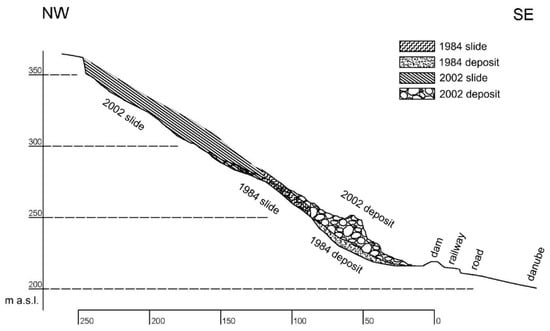 The rockslide shaping the present state occurred on 11 October 2002 (Figure 1). The rock mass most probably slid down on the same foliation plane, on which the 1984 slide occurred (Figure 4), with relatively low velocity. Thus, the main part of the sliding mass did not reach the railway.