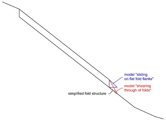The question arises, why the whole rock mass lying on an amphibolite layer did not slide down in 2002, but only the southwestern part of it. The geological investigations revealed that the foliation is strongly folded in the northeast area (area 1; Figure 2). The upper fold flanks clearly dip more gently than the foliation in the southwest area, where the 2002 rockslide took place. Thus, sliding is possible only if either the folds are sheared through or if the rock in area 1 slides on the flat (i.e., horizontal) fold flanks (Figure 5).