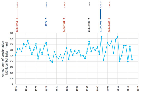 Figure 6 shows the annual sums of precipitation recorded by the weather station in Mühldorf bei Spitz and the rockslides in the Spitz an der Donau quarry between 1960 and 2017.