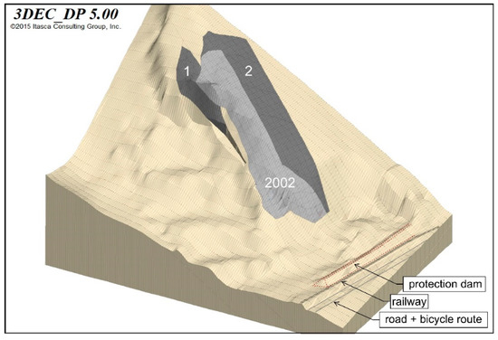 As described above, future rockslides can cause only loss of material values and consequences can be expressed in money per time. According to Amatruda et al. [5], consequences of landslides (“damages” respectively) can be divided into direct and indirect damages. In the case of Spitz, direct damages consist of the costs of rockslide debris removal and reconstruction of the traffic routes. There will be no social and environmental damages and, thus, indirect consequences will consist only of economic damages, such as reduction of tourism and detours of local inhabitants and of enterprises. For this reason, the travel distances (“runouts”) of two detachment scenarios have been calculated using the three-dimensional, numerical Distinct Element Code 3DEC [9]. This method has been chosen because empirical or GIS-based methods [7] would have been unable to take into account the complex spatial conditions in Spitz.
