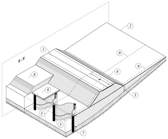 The axonometric view (with openings) of a section of landslide stabilised with a spatial supporting construction (SSC): 1—Road on embankment; 2—Outline of upper edge of landslide; 3—Principal drain pipe for dewatering the slope was installed in sheet piles; 4—Surface water intake; 5—SSC with tight walls of steel sheet piles; 6—SSC with slab of reinforced concrete (wale slab) uniting buttress elements; 7—SSC with the steel pile supporting the buttress; 8—SSC with wale slab ballast to load buttress; 9—Edge of separated slump block fragment, for which the b width SSC module stability analysis was conducted; X-X is the cross-sectional plane oriented along the directionof landslide movement.