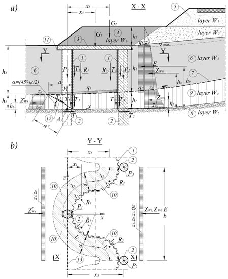 - ZW4—resultant force (for a single SSC module) due to active pressure of soil in layer W4 (under the sliding surface) and the water pressure on the SSC,