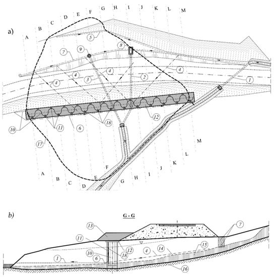 Landslide and buttress constructed as an SSC: (a) layout plan showing the landslide outline with drain system and the SSC; (b) the cross-section of G-G across the landslide and SSC; 1—Existing culvert for water from drain trench; 2—Existing culvert for water from the central part of landslide; 3—Designed steel culvert pressed along the rock ceiling; 4—Drain pipes dewatering the landslide mass; 5—Drain pipe catching water from the slope; 6—Drain pipes draining water from under the buttress; 7—Designed drain pipes dewatering gravel in the sheet piles; 8—Existing collective chamber for leaking water; 9—Collecting well for leaking and surface water; 10—SSC wall from steel sheet piles; 11- SSC drilled piles supporting load force of buttress; 12—SSC reinforced concrete wale slab; 13—SSC ballast in the form of a soil bank; 14—Slide surface of the landslide; 15—Rock alluvium; 16—Rock; 17—Edge of landslide; A-A to M-M cross-sections, in which stability conditions of the whole slope and the buttress were analysed; 18—Vertical column-gravel drains in the geotextile sleeve inserted previously into the drained space.