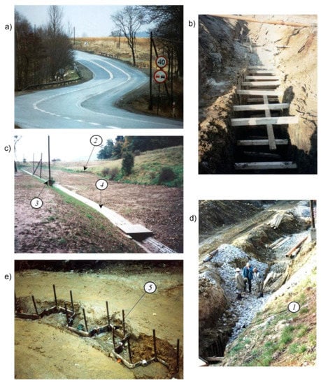 The landslide dome constituted a thick layer of liquefied base soil (4–10 m) moving with the road bank on the loamy rock slope composed of mica schist. The sliding layer formed on the mica schist. Due to this fact, the stabilising of the landslide dome required the application of a special SSC formed in the way shown in Figure 3 and Figure 4e. In addition, it was necessary to construct a drainpipe for dewatering (Figure 3a item 7 and Figure 4b,d) as well as a culvert (Figure 3a item 3) made by the pressure system. The common effects of dewatering the rock mass and securing the SSC stabilised the landslide mass on the road, which was not accomplished in the prior 60 years of its existence.