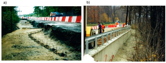 The road section was subject to long-lasting (over 50 years) slow slippage. Displacements were slow during periods without precipitation and more rapid during periods of intensive rainfall. The sliding section of the road crown was successively repaired using asphalt concrete. Because a business (an inn) was located on the road near the landslide, it was necessary to widen the road by one traffic lane along the entire length of the landslide (Figure 5b). Due to this fact, it was considered necessary to construct the buttress (Figure 5 and Figure 6). SSC was supposed to stabilise the long-lasting active landslide and at the same time, widen the road in the vicinity. The magnitude of unbalanced pressure on the slump block wasdetermined according to Ukleja [] following the principles presented above in Section 3.1. This pressure had to be balanced with the buttress shown in Figure 6.
