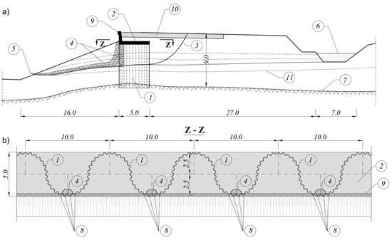 The SSC stabilizing the landslide (also presented in Figure 5): (a) The cross-section across the landslide, road and spatial supporting construction; (b) The horizontal cross-section Z-Z across the buttress, 1—Tight steel wall from the sheet piles; 2—Reinforced concrete wale; 3—Slide surface of the landslide; 4—Drain pipes behind and in front of the tight wall; 5—End of the drain pipes; 6—Water collected in the trench; 7—Rock alluvium; 8—Holes in the sheet piles; 9—Retaining wall; 10—Road; 11—Soil layer margins. All dimensions are given in [m].