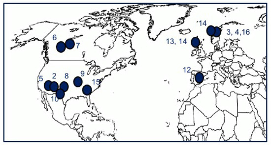 Map showing the locations of seismic data cited in this paper. The numbers refer to the figures in this paper.