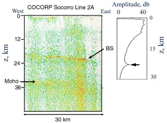 The anomalous shear wave reflectors at midcrustal depths near Socorro, New Mexico, referred to as the Socorro Magma Body (SMB; [36]), attracted the attention of the nascent COCORP (Consortium for Continental Reflection Profiling) project in 1976. COCORP multichannel vibroseis source surveys then imaged an anomalously strong P wave reflector (called the Socorro Bright Spot) that corresponds directly with the anomalous S reflector (Figure 1 and Figure 2; [37]). The unusually strong amplitude P waves from the COCORP controlled source survey (Figure 2) and the anomalous S waves reflections on microearthquake recordings [34,38] are both consistent with a solid–fluid interface [35,39]. A hot magma interpretation is also consistent with the tectonic setting—i.e., a Cenozoic rift characterized by high heat flow—and is supported by MT measurements of high conductivities at mid-crustal depths [40]. Of particular significance are the geodetic and INSAR observations of contemporary surface uplift that suggest active magma inflation at the depth of this reflector [41,42,43]. The receiver function analysis of teleseismic data [44] confirms that the SMB is a relatively thin layer of magma corresponding to the seismic reflection bright spot.