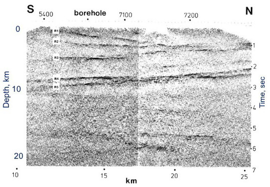 Strong subhorizontal reflections mapped in the upper 10 km of Proterozoic crust by seismic reflection profiling at the Siljan Ring Sweden [55]. Depth assuming the average velocity of 6 km/s. R1–R5 label individual reflectors in this stack.