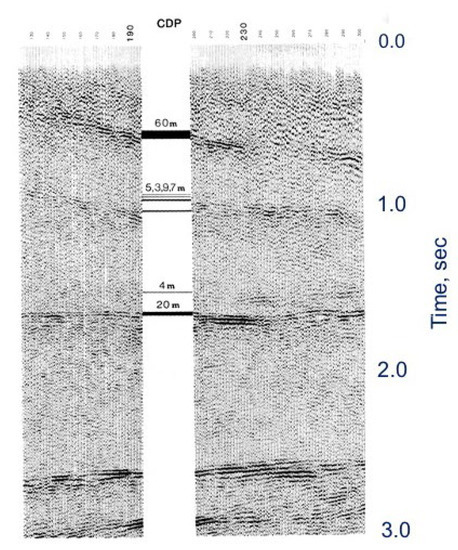 Detail of the Siljan Ring reflections in Figure 3 correlated with the borehole observations of diabase intrusions (solid black lines, with indicated thicknesses [55]). The sills date from 850 to 1700 my. This clear identification of strong reflectivity with mafic sills [55,56] has served as a reference for the interpretation for similar appearing reflection sequences in other areas.